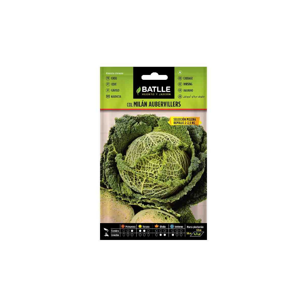 Col Milán Aubervillers es variedad de col rústica de pie corto y hojas finas y rizadas, cuyo repollo es grande, con forma redonda, pudiendo alcanzar hasta los 2,5 kg.